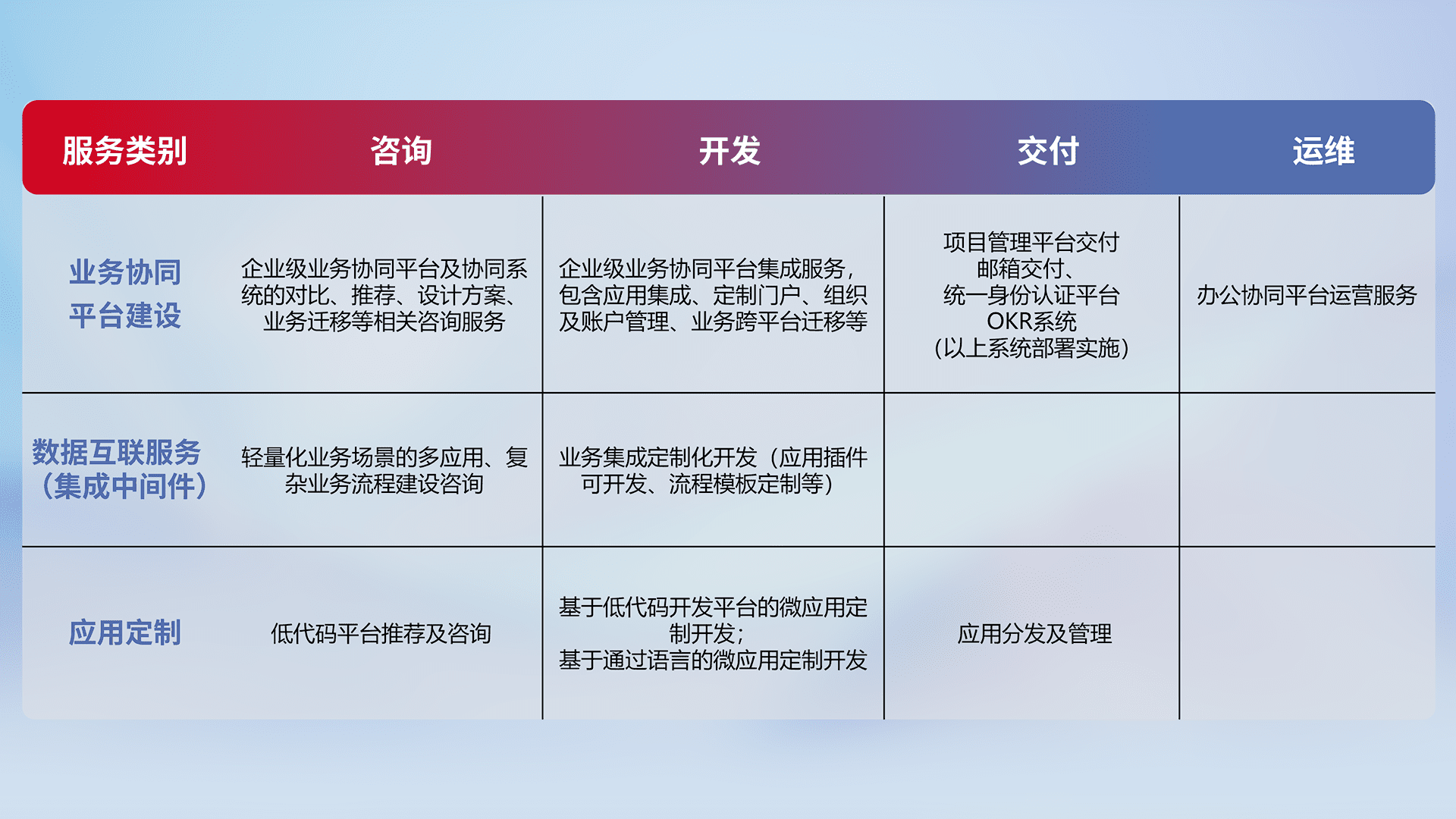 针对钉钉、、、企微、、IDaas等平台级产品提供产品的规划、、、、方案、、、、交付、、、、定制化开发等服务,,,实现如统一协同办公、、智能客户服务、、混合会议管理、、智能数据查询、、、等业务场景,,,实现数字化转型。。。